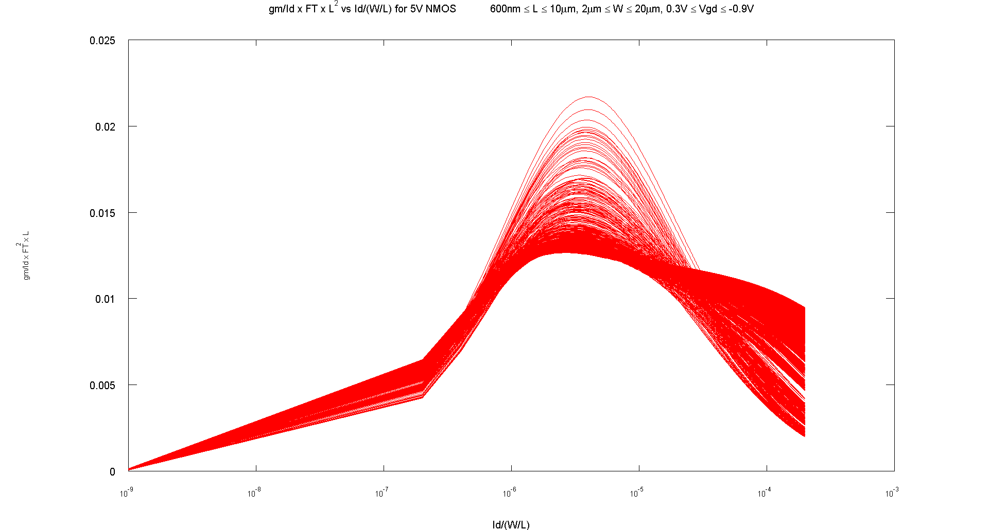 As can be seen all the family of curves nearly lie at the same place. So now if we know the current we can choose an operation point and determine the right size just by looking at the graph. For example for a high gain device choosing a gm/Id of 20 and if the current is 5uA then we know the gm is 100uS and the corresponding Id/(W/L) is about 5e-7 which means that W/L = 5e-6/5e-7 = 10. Choosing an L with other constraints like matching or capacitance will give the size of the device directly!