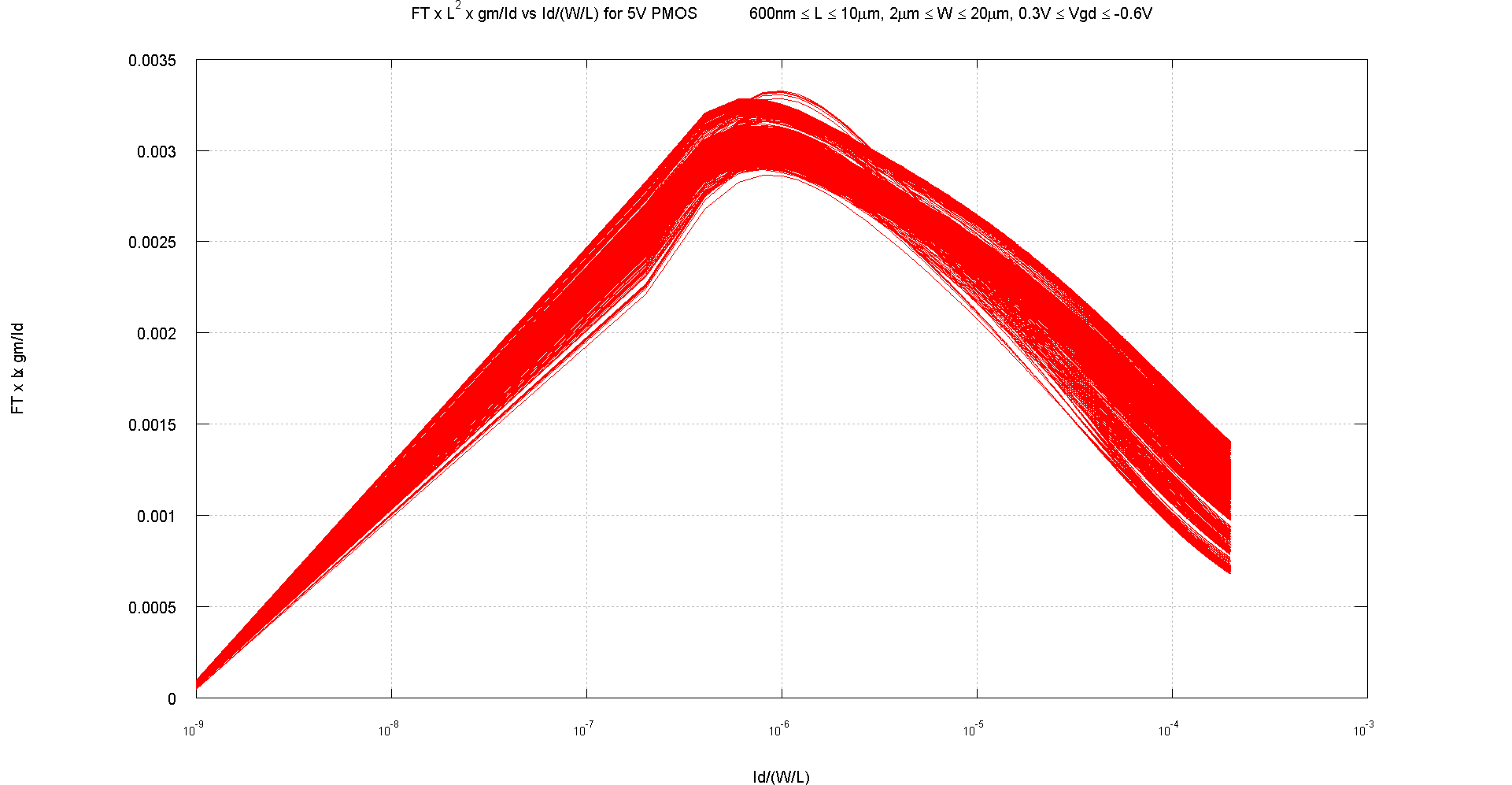 The graph below shows the gm/Id*Ft*L^2 vs Id/(W/L) graph for the 5V PMOS transistors in the same process, looks much more consistent than the NMOS transistors. It could be that the extra vgd range in 5V NMOS causes the difference: