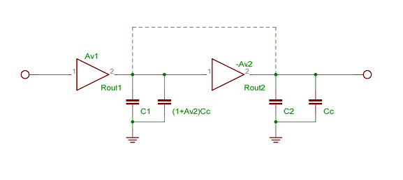 In this type of compensation a capacitor is placed across a negative gain stage causing the miller multiplication of the capacitance on the input side making that the dominant pole.