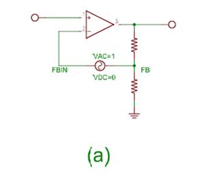 Circuit (a) can be used also to do the transient simulation since the AC voltage source won’t affect it. But when the AC simulation is done then the Magnitude plot should be plotted for Vdb(FB) – Vdb(FBIN) and the phase plots should also be plotted for FB-FBIN, so it is sort of inconvenient. Also see the Feedback Loop gain calculation analysis, this will not give the total result if the input impedance is not infinite, we need to calculate it using a test current source also and then calculate the actual loop gain from the combination of the results. So the point to break the loop is important if accurate results are needed by just 1 analysis.